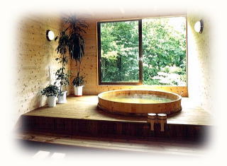 お風呂 別棟にある丸型の木のお風呂は4~5人でもゆったり入れます。